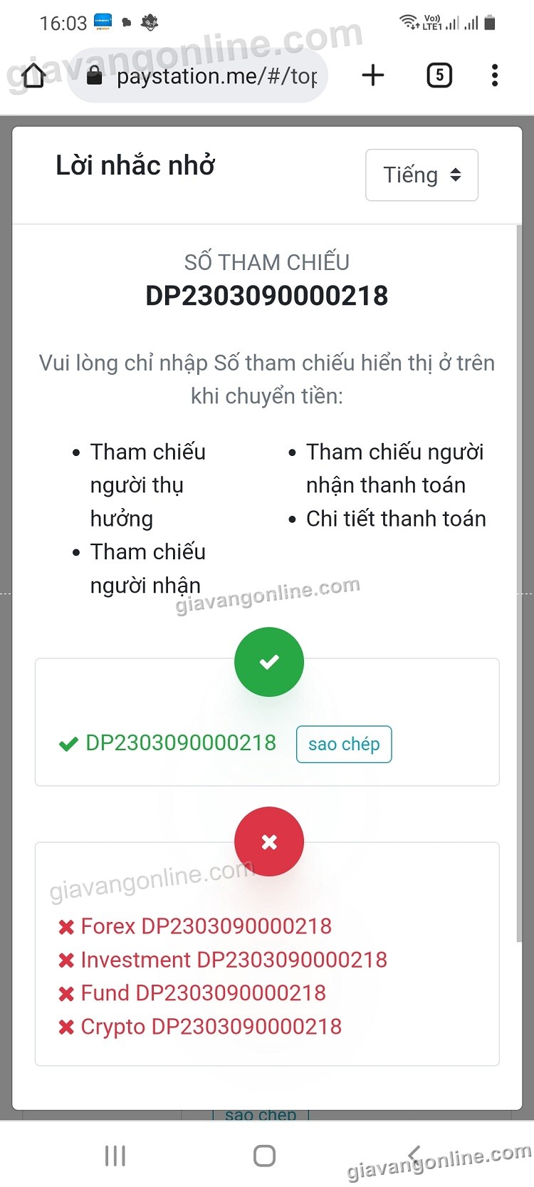 * Sẽ có lời nhắc nhở bạn ghi đúng mã nạp tiền (số tham chiếu) vào phần mô tả lúc chuyển khoản, có nút "sao chép" để bạn copy lại