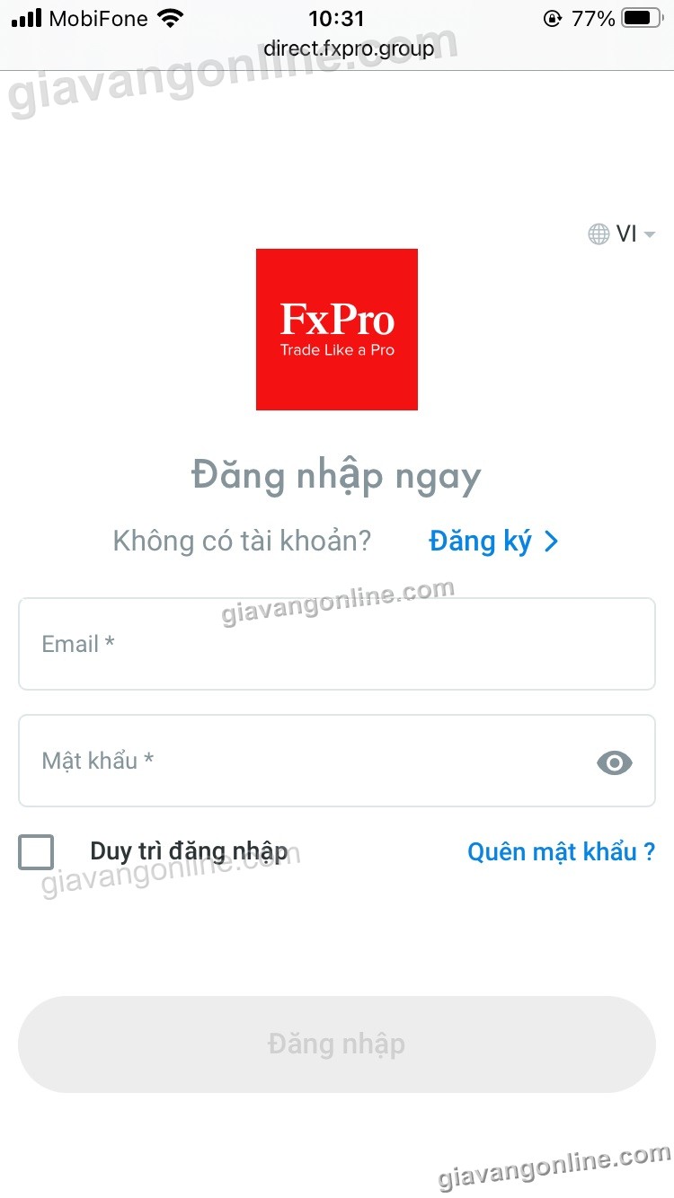 Lưu ý: Email và mật khẩu bạn đã tạo lúc đăng ký với fxpro, nếu quên bạn bấm vào chữ "Quên mật khẩu" để lấy lại