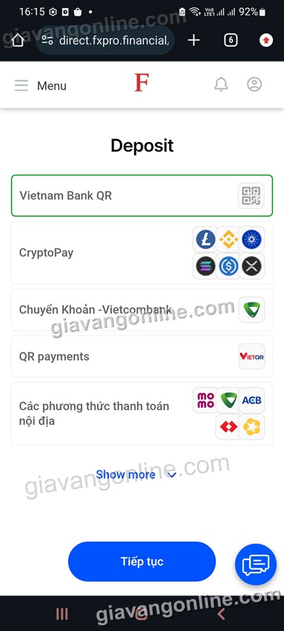 - Bạn dùng app của ngân hàng để quét mã QR, khi hoàn tất thì tiền sẽ vào Ví Fxpro